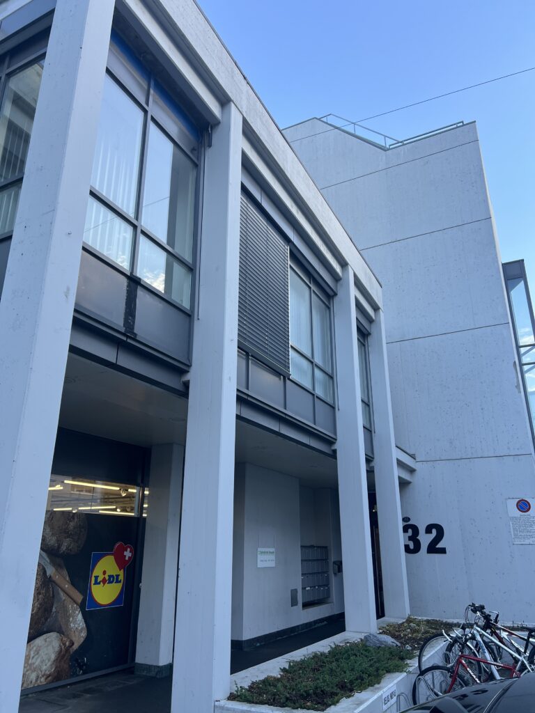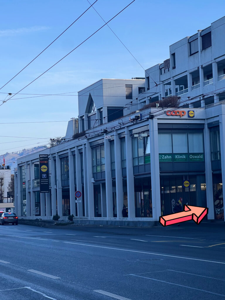 Falls Sie in der Tiefgarage parkieren, bitten wir Sie das Gebäude kurz zu verlassen und den Eingang von aussen (neben Lidl) bei Nr. 32 zu nutzen.